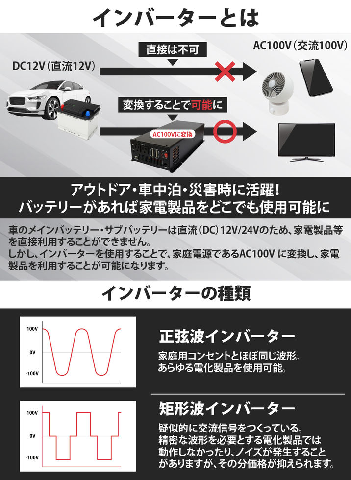 ・家庭用と同じ、サインウェーブ(正弦波)を出力できるインバーターです。正弦波インバーターでは一般的な矩形波インバータと異なり家庭と同じ環境で使用できるため、モーターを使用する製品(扇風機、電動ドリル等)も家庭と変わらない快適さでご使用いただけます。